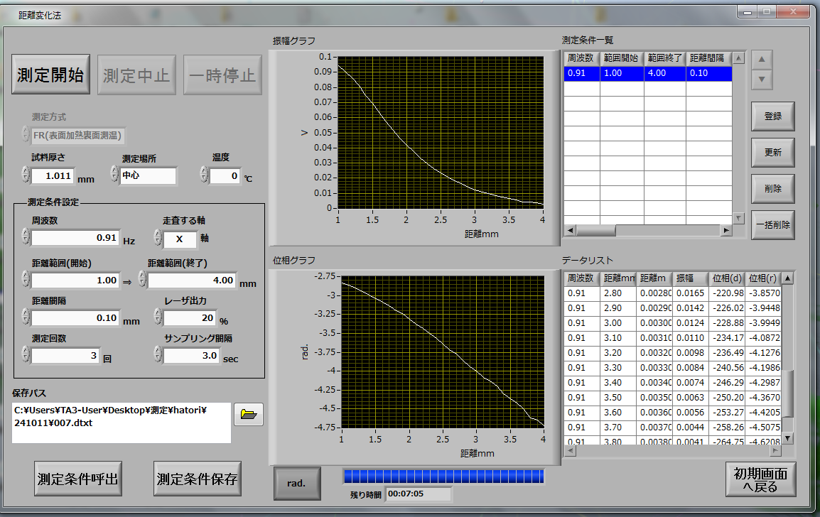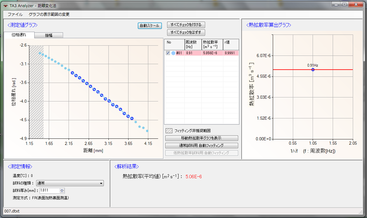 サーモウェーブアナライザで測定と解析を行います。次の写真は測定画面及び解析画面です。